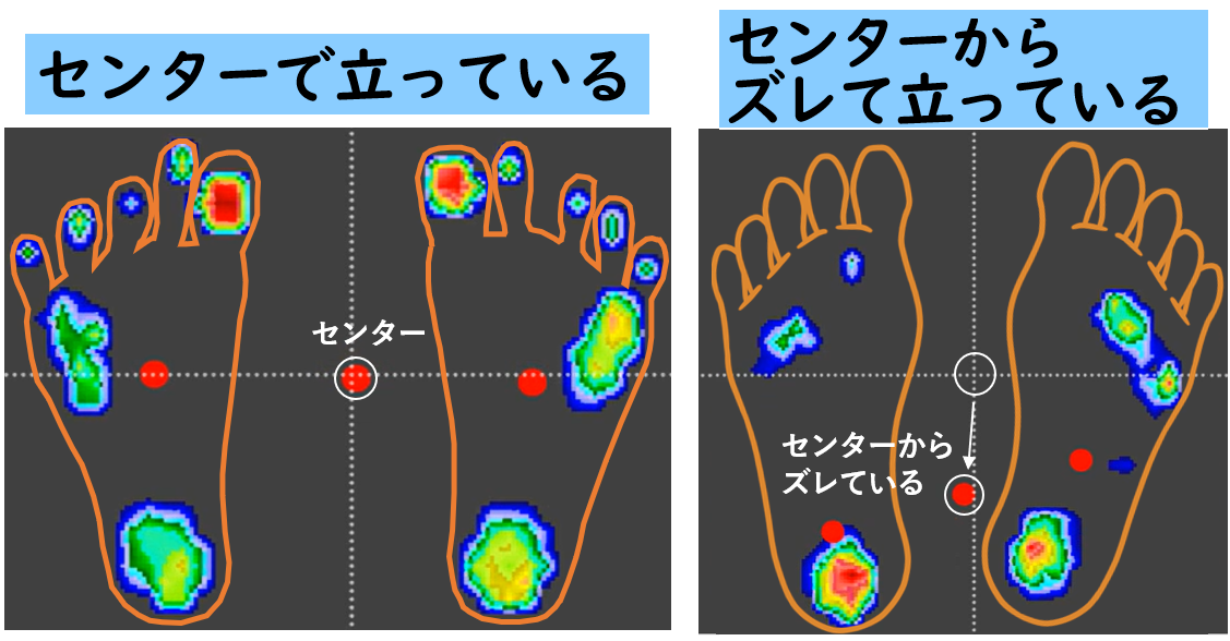 右側の足は、重心がセンターから後ろ側(踵側)にズレてしまっています。後に偏っている間違った立ち方